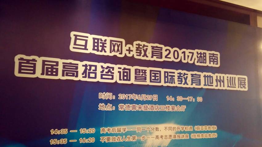 2017年6月29日,“互联网+教育2017湖南首届高招咨询暨国际教育巡展”(常德站)在常德五星级酒店——喜来登酒店举办。活动当天虽然下着大雨,但是并没有阻挡关心高考招生咨询的考生和家长们的脚步,活动现场汇集了多所院校和来自常德各个地市高中学校的考生和家长。